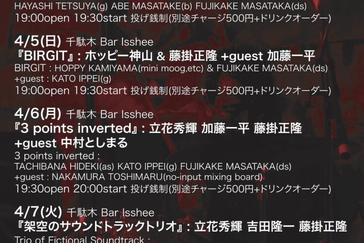4/3(金) 千駄木 Bar Isshee 『若林一也sax+斉藤圭祐sax+藤掛正隆ds』 WAKABAYASHI KAZUYA(sax) SAITO KEISUKE(sax) FUJIKAKE MASATAKA(ds […]